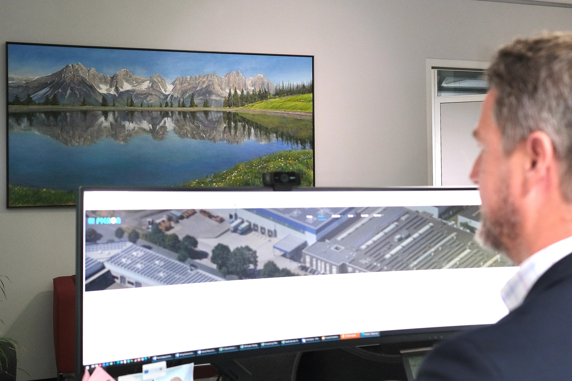Es ist ein kraftvolles Bild – emotional, symbolisch, nahbar. Und es erzählt viel über den Führungsstil im Unternehmen PIERON. Gemeinsam, aber mit Richtung. Verantwortlich, aber menschlich. Das zweite Bild, welches Sven beim Blick über seinen Curved-Flat-Screen genießen darf, ist der Astbergsee in Going in Österreich. Er sagt, es sei wie das erste eine private Fotografie von ihm, die durch die beiden Künstlerfreunde aus Düsseldorf nachgemalt worden sei. Es tue einfach gut, im Arbeitsalltag einen Blick auf einen seiner Lieblingsurlaubsorte werfen zu können.