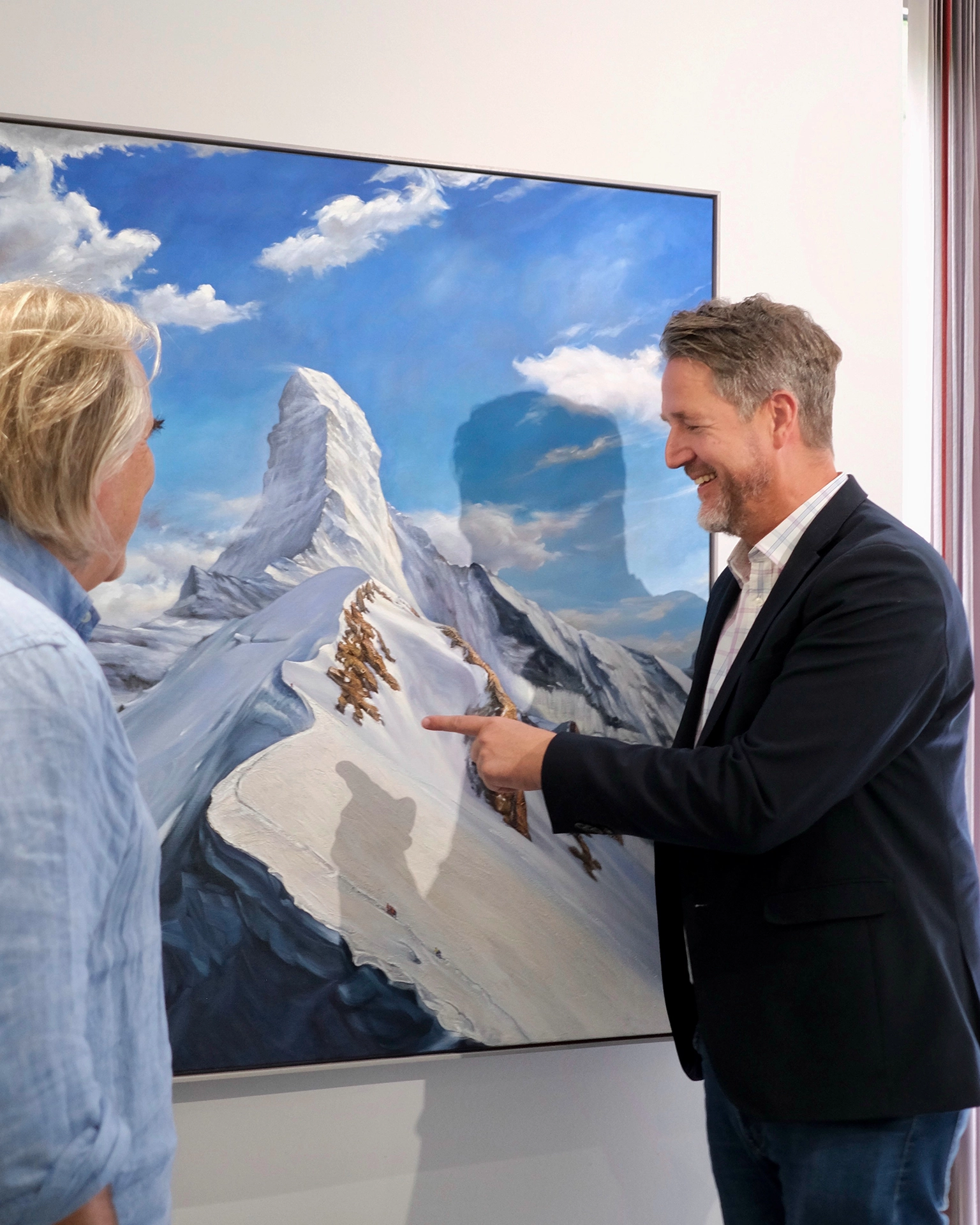Zurück ins Jetzt und in das Büro von Sven Pieron. An der Wand hängt ein Gemälde, das sofort ins Auge fällt. Zwei Bergsteiger auf schroffem Grat, die Silhouetten rau und eindrucksvoll gezeichnet. Ein weiter Himmel, klare Linien, kräftige Farben.