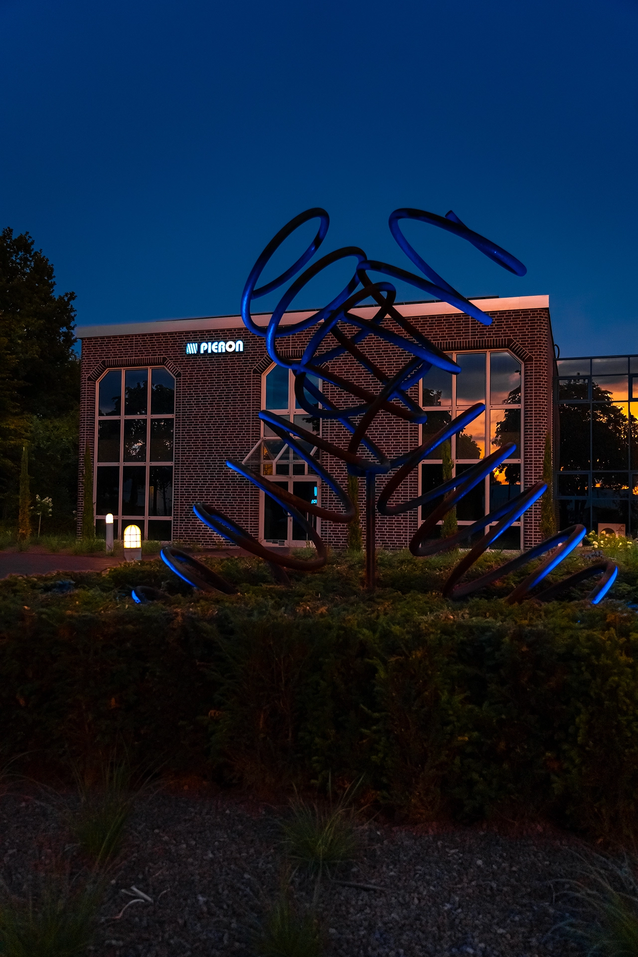 Das passt perfekt – denn die Feder ist schließlich das Herzstück von PIERON. Und es begegnet uns auch visuell, gleich beim Betreten des Unternehmensgeländes. Eine große Skulptur aus Metall, gefertigt von Bollmann Metalltechnik, prägt den neu gestalteten Garten und Vorhof, den sich Grandiflora auf die Visitenkarte schreiben darf. Sie erinnert an die Anfänge des Unternehmens – und an seine Weiterentwicklung. Denn längst ist PIERON nicht mehr nur Federnhersteller. Die Produktpalette reicht inzwischen weit, von Druck- und Drehfedern über Spann- und Lamellenringe, Drahtbiegeteile, Wellenfedern und Ring-Kontaktfedern über Stanz-Biegeteile bis hin zu Baugruppen.