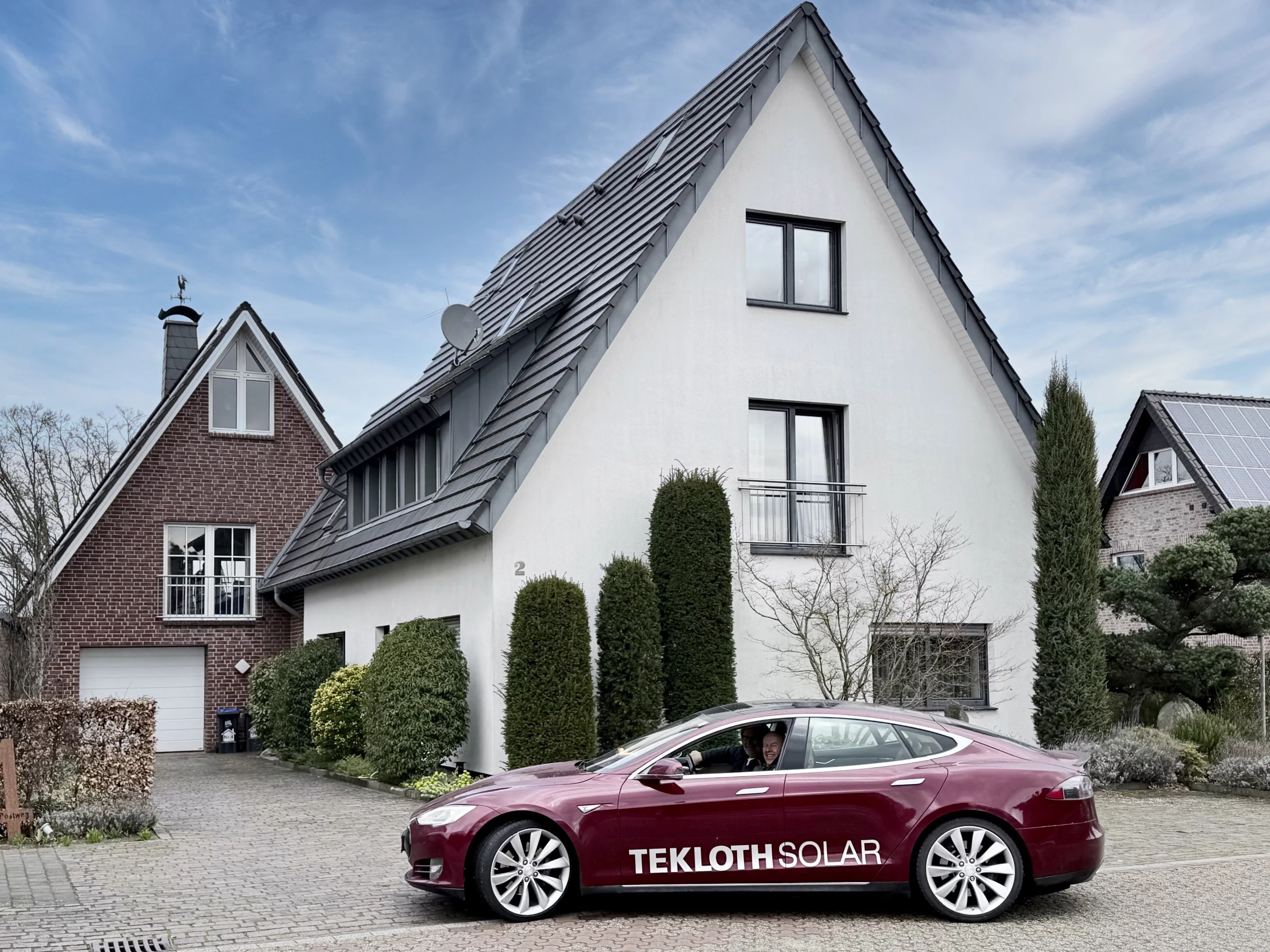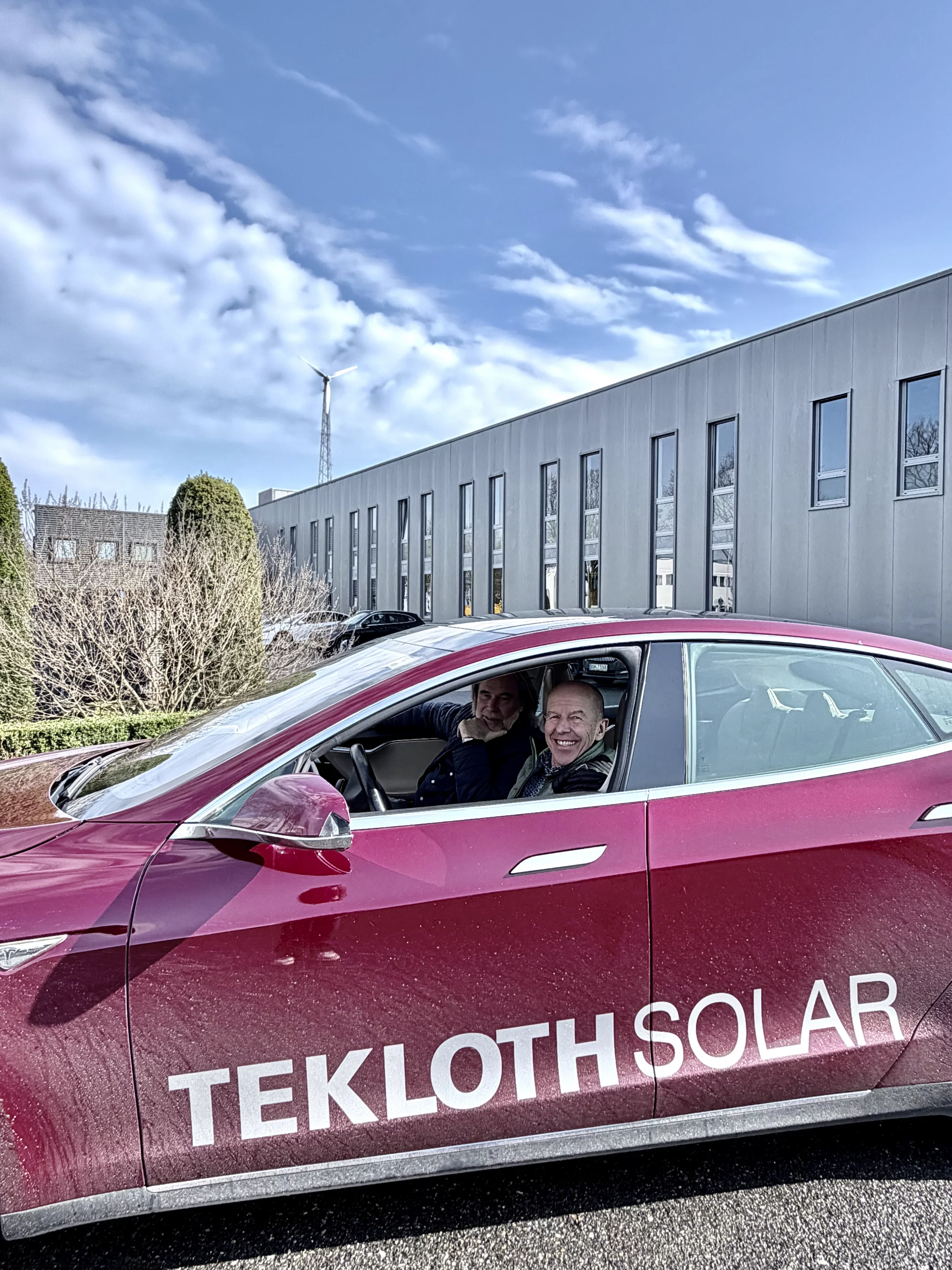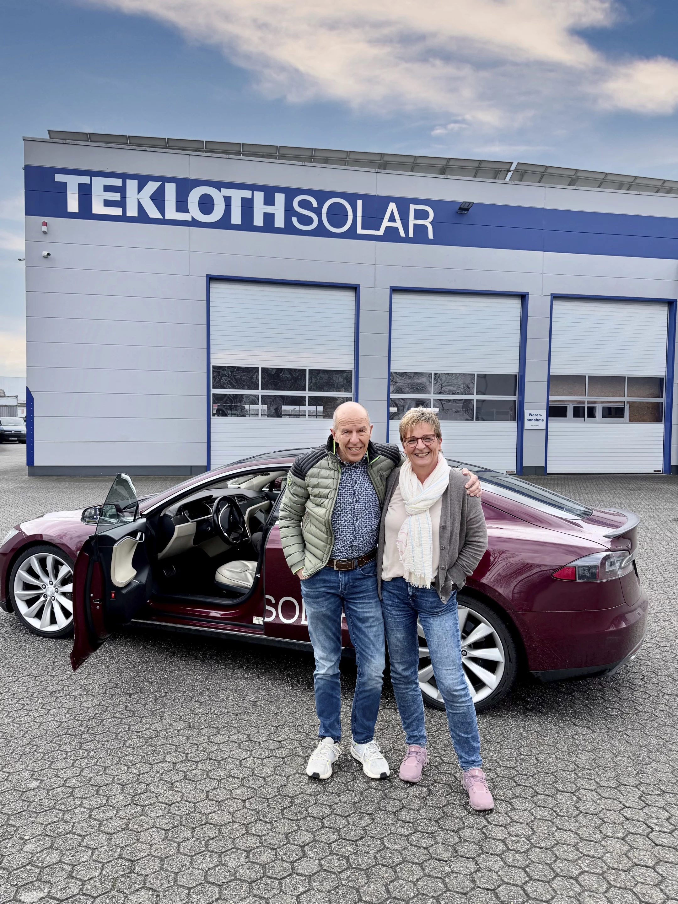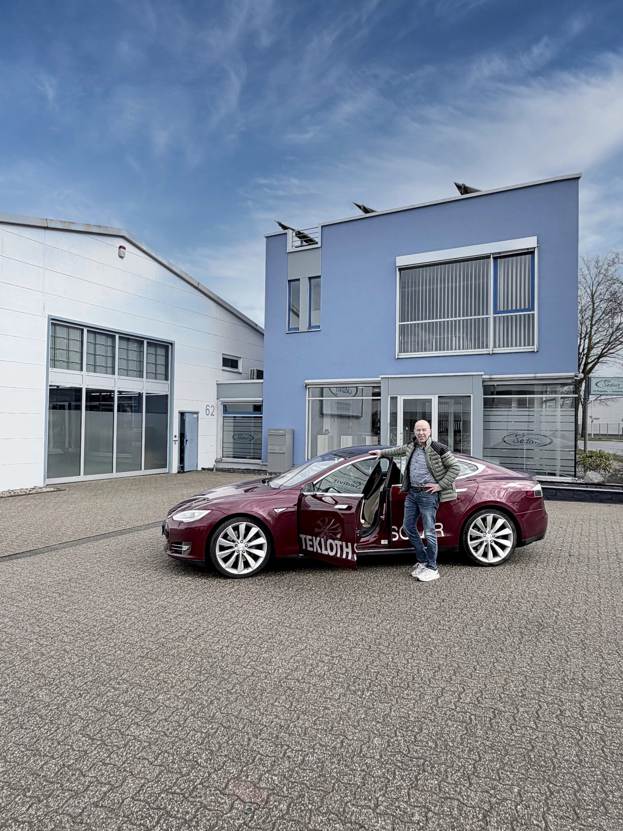 Wir steuern den roten Tesla auf das Gelände der TEKLOTH Solar GmbH am Schlavenhorst 105. Ein Stopp, der eigentlich die rasante Entwicklung der Tochtergesellschaft visualisieren sollte, die Jürgen vor gut 15 Jahren gemeinsam mit Franz Schmeink als 50/50-Projekt gegründet hat.