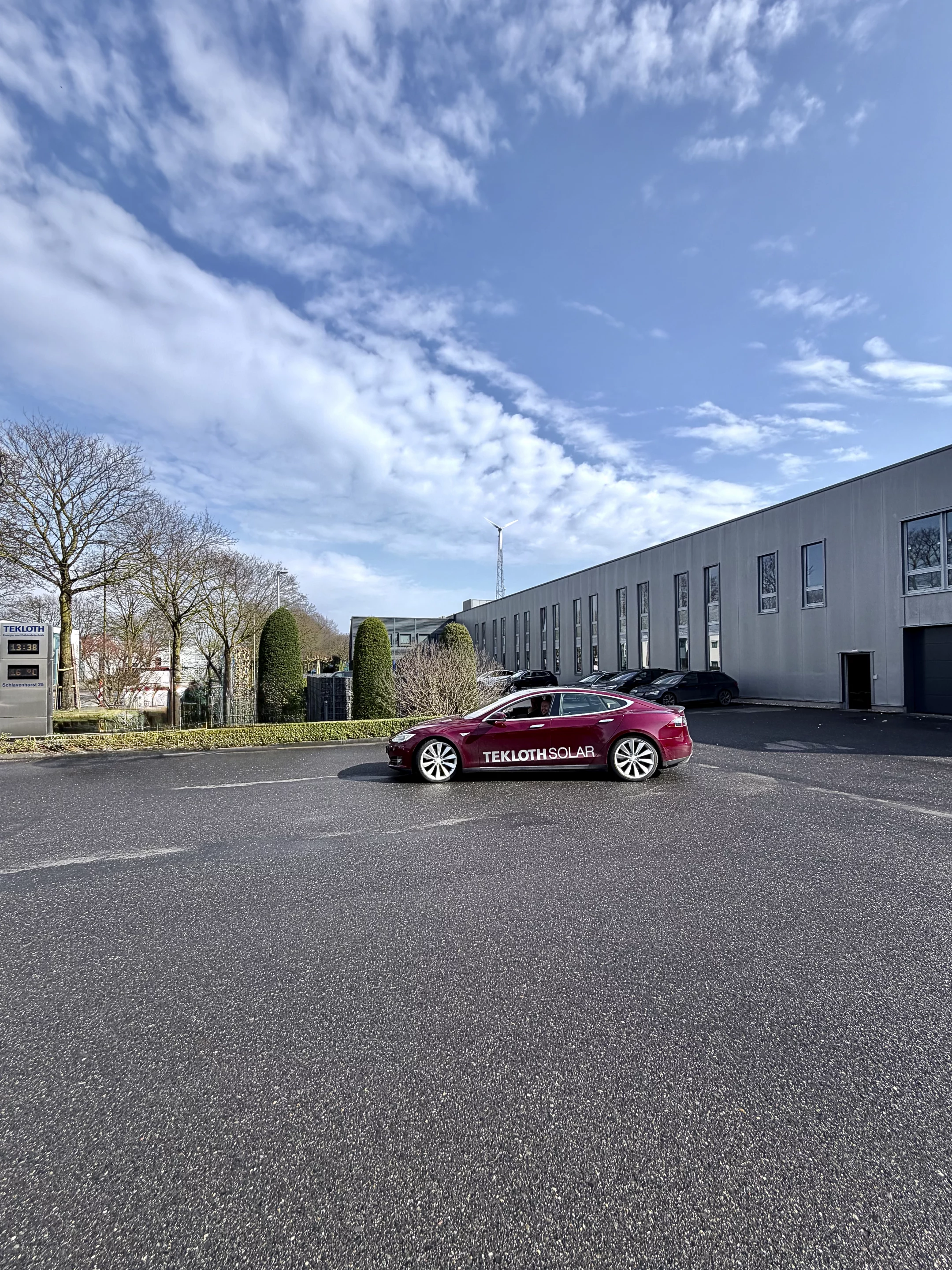 Dienstag | 10. März 2026 | 12:25 Uhr 46395 Bocholt | Schlavenhorst 25 | vom Gelände der TEKLOTH GmbH … unterwegs durchs Industriegebiet … auf den Straßen der Stadt | Mobiler Untersatz: Roter Tesla-Youngtime
