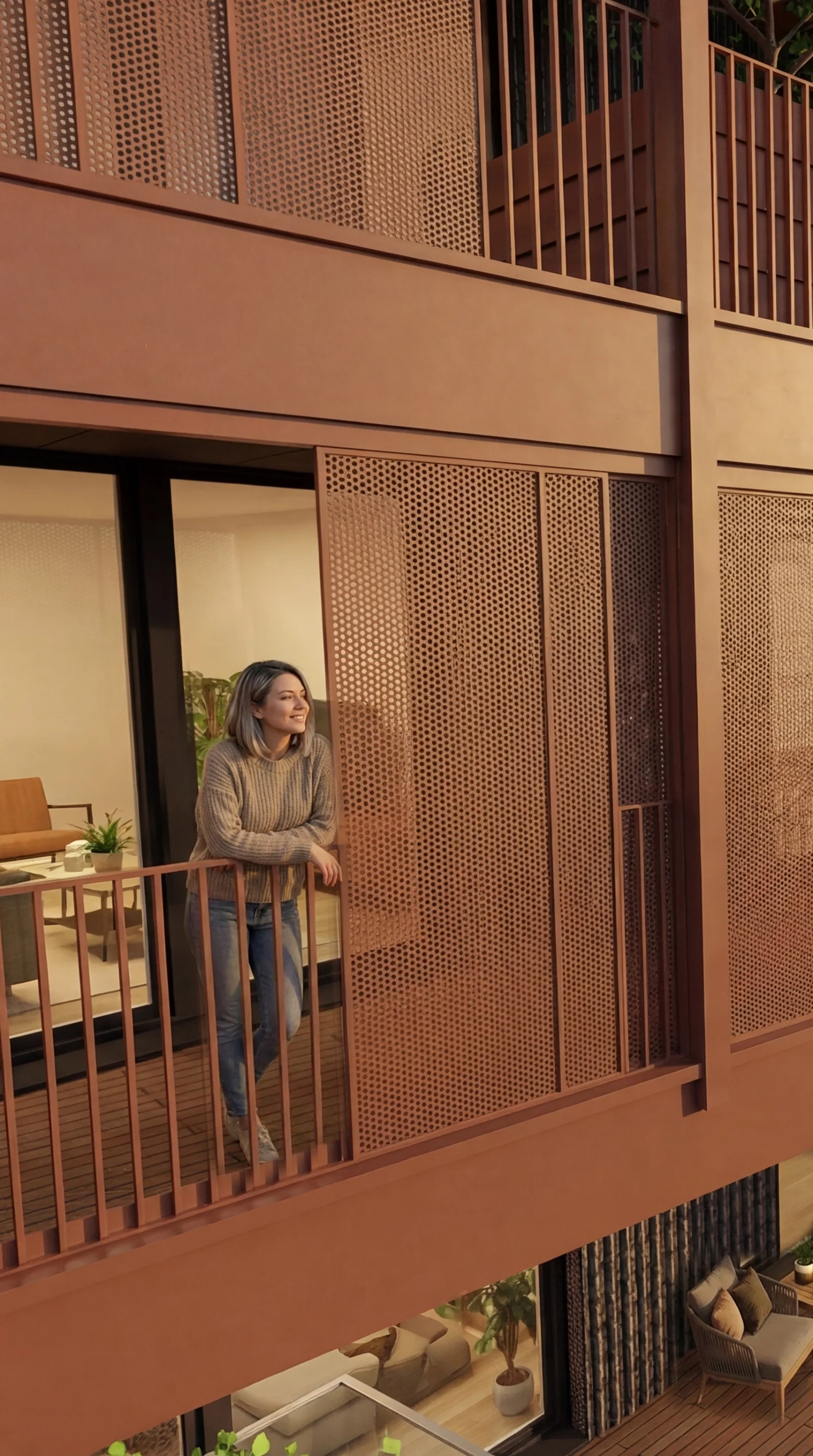 Florian Schillings: Genau da kommt diese zweite Fassadenebene ins Spiel. Du hast das eigentliche Hauptgebäude, und davor liegt quasi als schützende Pufferzone noch einmal eine zweite Haut, die den kompletten Loggiabereich umschließt. In dieser Ebene laufen smarte, verschiebbare Elemente. Wenn die Sonne voll von Süden knallt oder du einfach deine Ruhe haben willst, schiebst du dir dein Element genau dorthin, wo du es brauchst – und hast sofort perfekten Schatten und absolute Privatsphäre.