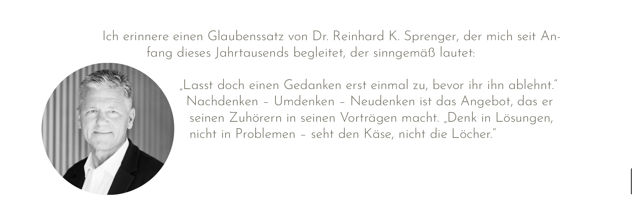 Ich erinnere einen Glaubenssatz von Dr. Reinhard K. Sprenger, der mich seit Anfang dieses Jahrtausends begleitet, der sinngemäß lautet: „Lasst doch einen Gedanken erst einmal zu, bevor ihr ihn ablehnt.“ Nachdenken – Umdenken – Neudenken ist das Angebot, das er seinen Zuhörern in seinen Vorträgen macht. „Denk in Lösungen, nicht in Problemen – seht den Käse, nicht die Löcher.“
