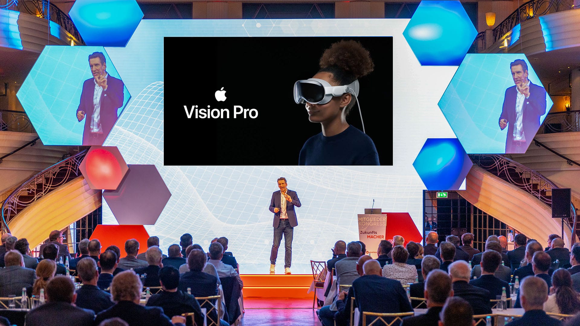 „Es handelt sich um die allererste Version der Apple Vision, für die derzeit ca. 4.000 Euro aufgerufen werden“, erklärte Collin und verwies darauf, dass sowohl Technik als auch Preis noch am Anfang stünden. „In ein paar Jahren wird das Ganze die Form einer normalen Sonnenbrille haben“, fügte er hinzu und unterstrich, wie schnell sich diese Technologie weiterentwickelt –