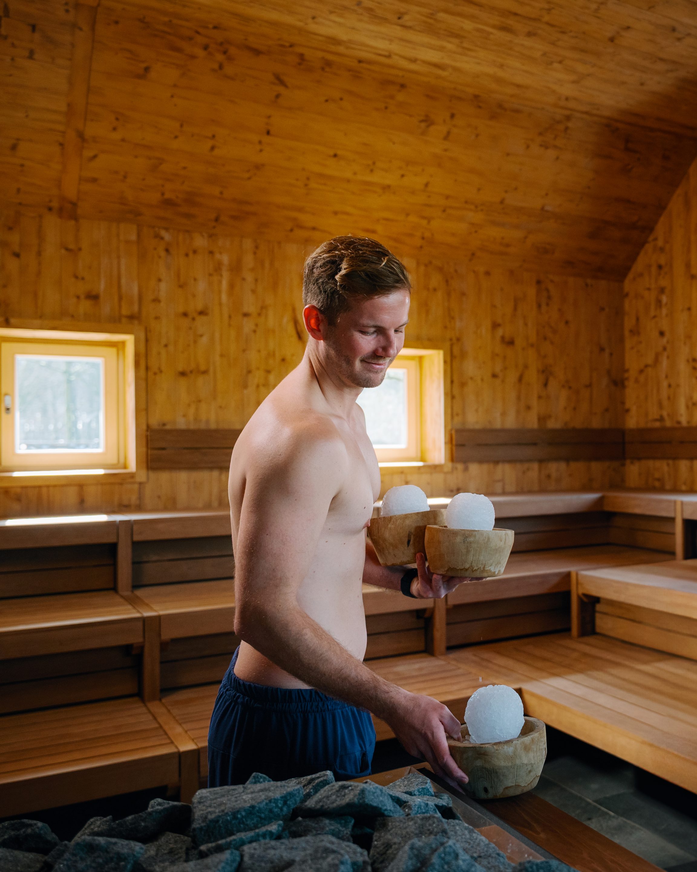 Besonders schön ist auch der Kamin, der sowohl von innen als auch außen sichtbar ist. Während die Hitze in der Swet Kamer langsam aufsteigt und man in die Entspannung gleitet, flackert das Feuer ruhig im Hintergrund. Es verleiht der ganzen Szenerie auch eine optische Wärme – fast schon wie ein inneres Licht, das Ruhe und Geborgenheit spendet.