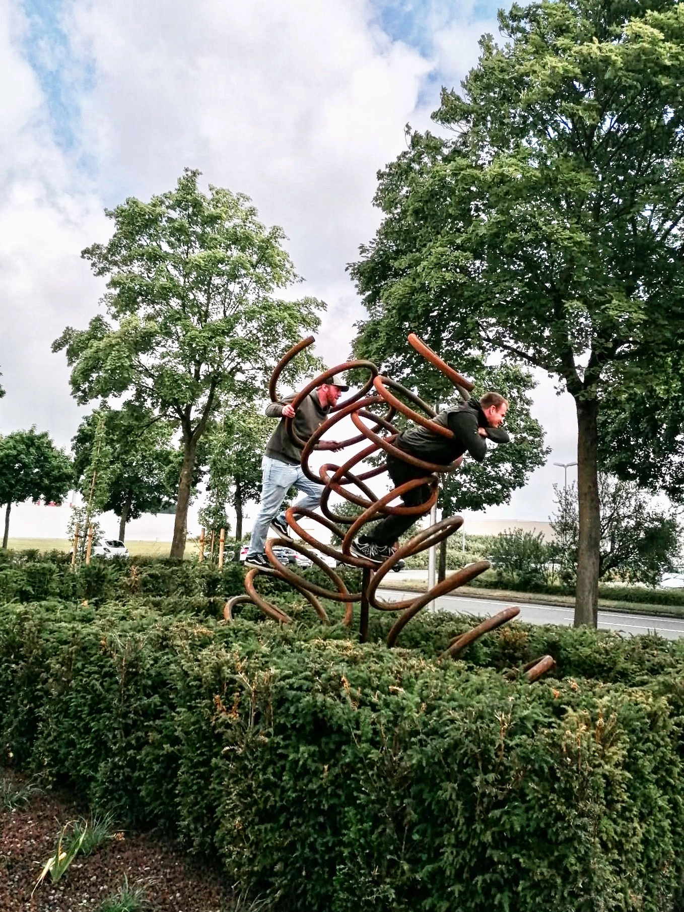 In diesem Jahr nun fielen uns die beiden – und ihr metallisches Engagement – im besten Sinne quasi vor die Füße. Zum einen in Form einer 3,50 Meter langen Federskulptur, die als Gemeinschaftsidee zwischen Sven Pieron und den Jungs von Grandiflora entstand – und von den IANs als Hommage an die Wurzel von Pieron realisiert wurde.