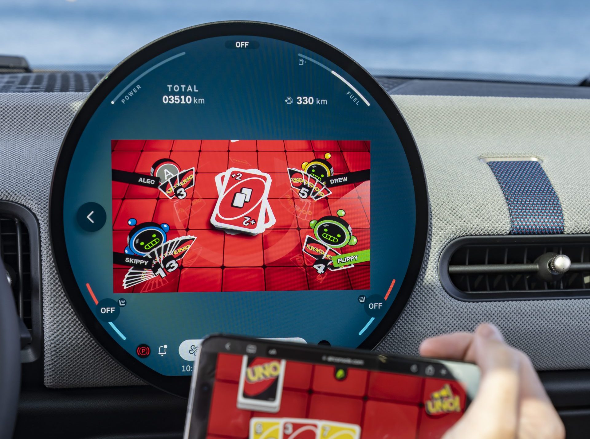 Mit unwiderstehlichem Charme und ausgeprägtem Charisma überzeugt der MINI Cooper C. In seiner jüngsten Ausführung präsentiert er sich mit schlanken Linien, aufgeräumten Flächen, ausgewogenen Proportionen und nun auch innovativem In Car Gaming. Das Nutzererlebnis im Innenraum wurde erweitert und ermöglicht den Insassen, Mattels klassisches Kartenspiel UNO™ mit der UNO® Car Party! im Auto