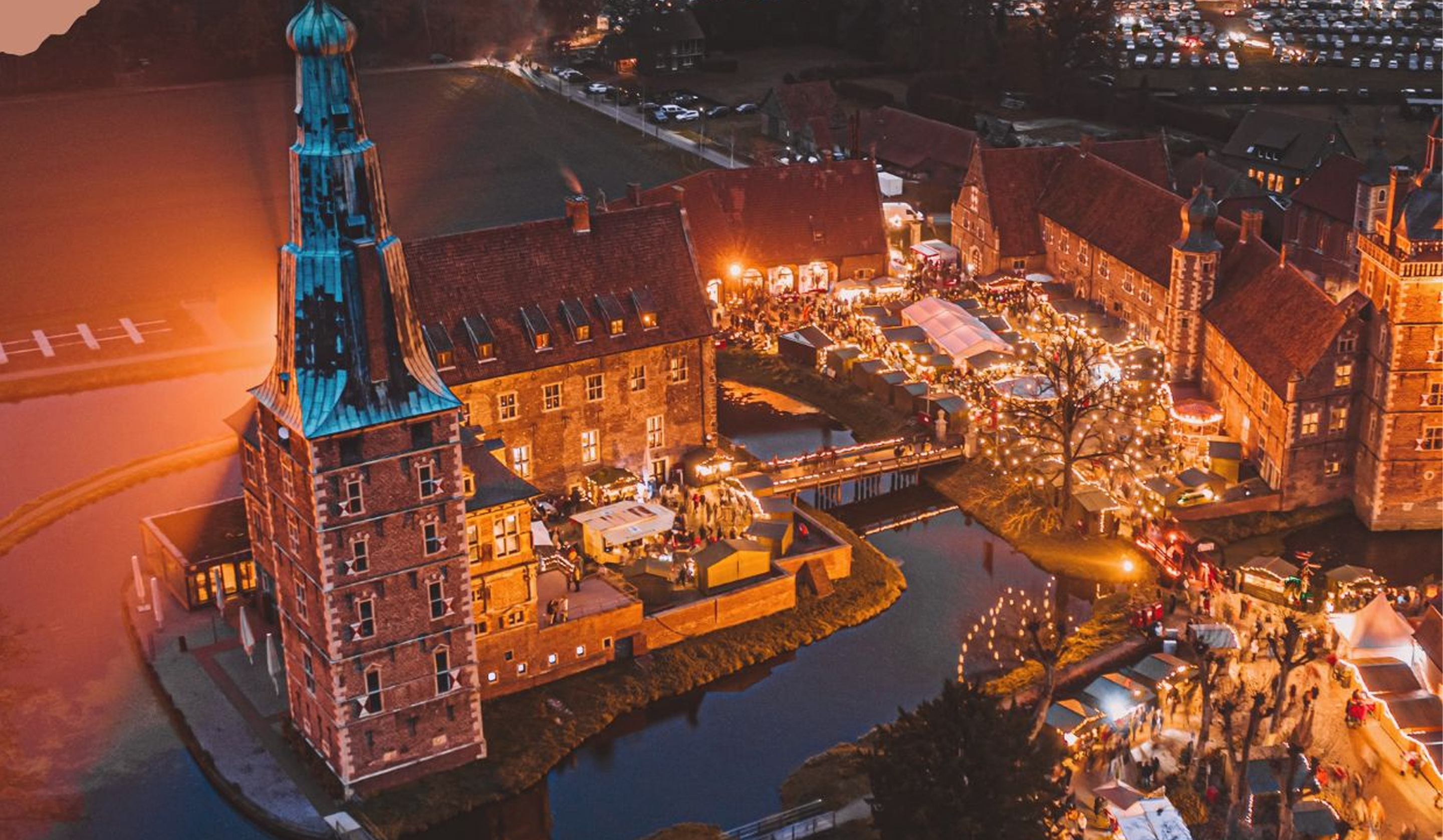 In der Woche des 2. Advents öffnet der Adventsmarkt am Wasserschloss in Raesfeld seine Tore mit funkelnden Lichtern und geschmückten Tannenbäumen.