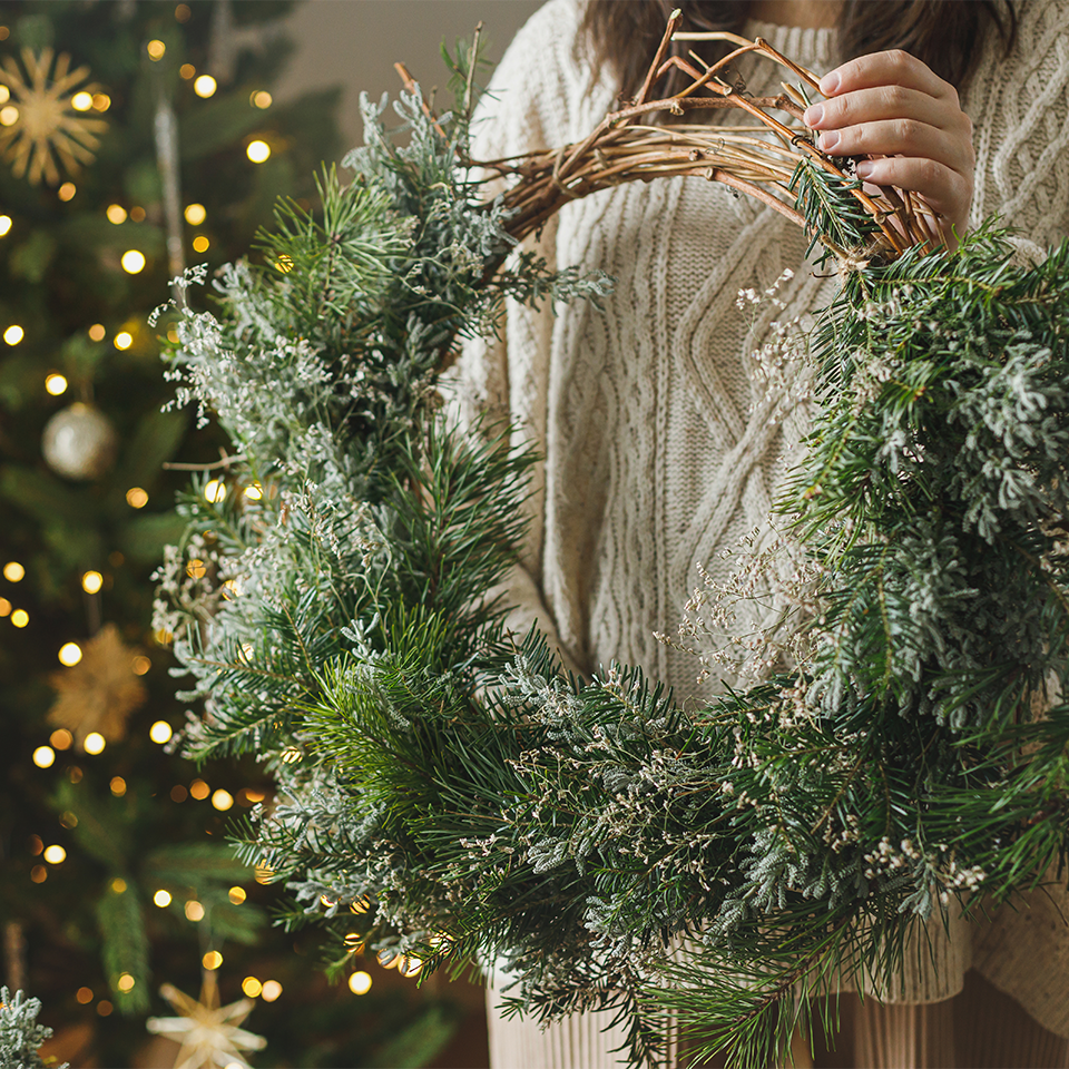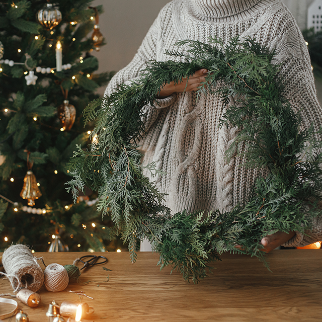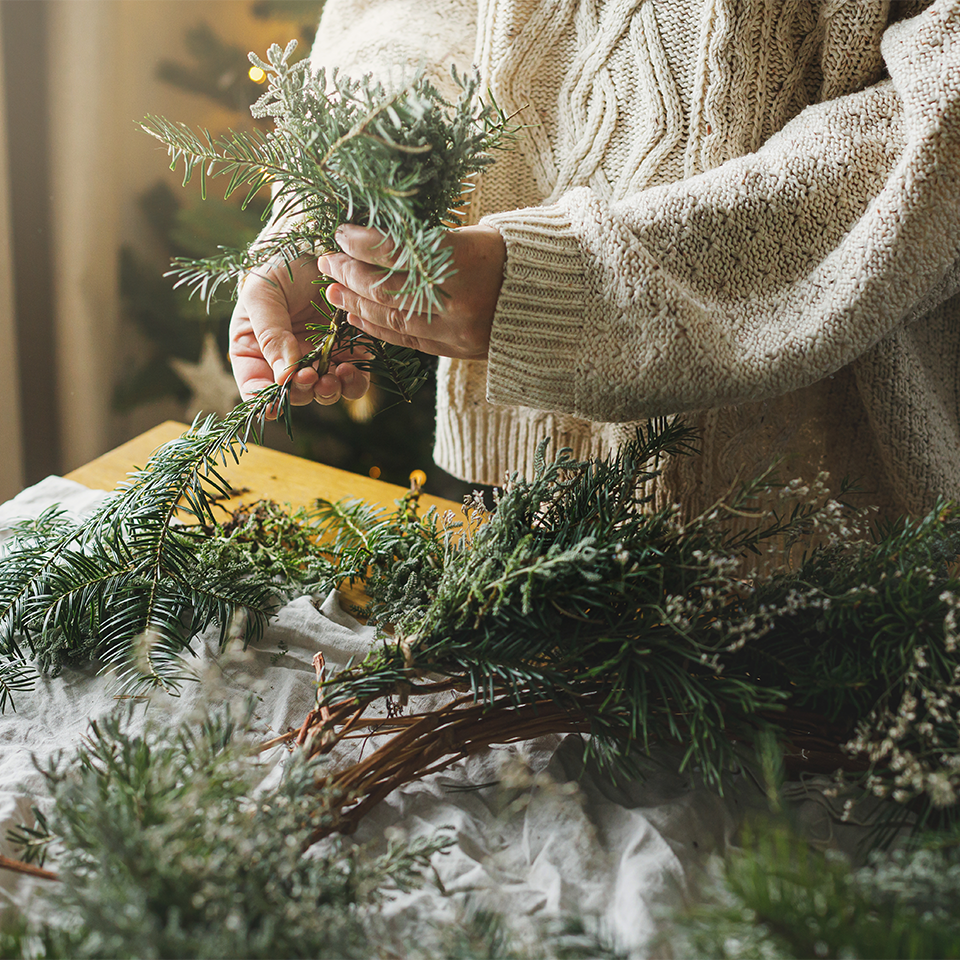 Man braucht nicht viel. Ein paar Zweige Tannengrün, gern selbst gesammelt bei einem Spaziergang durch den Wald, aus dem Garten, vom Wochenmarkt. Vielleicht ein bisschen Kiefer, Zypresse oder Eibe, für Struktur und Duft. Dazu getrocknete Binsen oder Gräser, ein Kranzrohling aus Draht oder Weide, ein bisschen Draht oder Schnur, eine gute Schere und wer mag, ein paar Bänder.