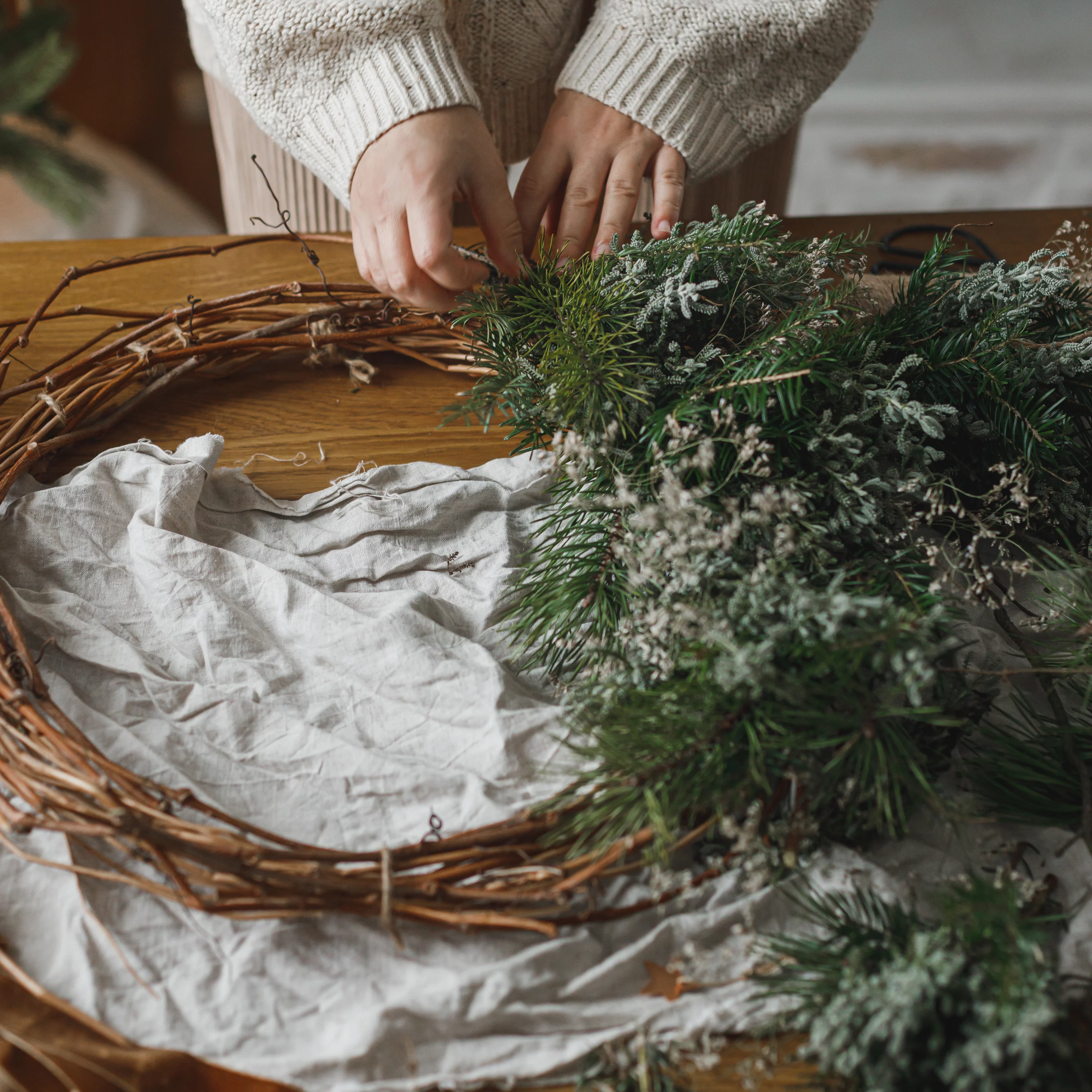 Komplett gebunden ist der Klassiker. Dicht, üppig, duftend. Die Zweige im Uhrzeigersinn auflegen, mit Draht umwickeln, überlappend weiterarbeiten. Binsen oder getrocknete Akzente dazwischen bringen Bewegung und Leichtigkeit. Ein schönes Samtband gibt dem Kranz den letzten Schliff – oder eben nicht. Dein persönlicher Geschmack entscheidet.