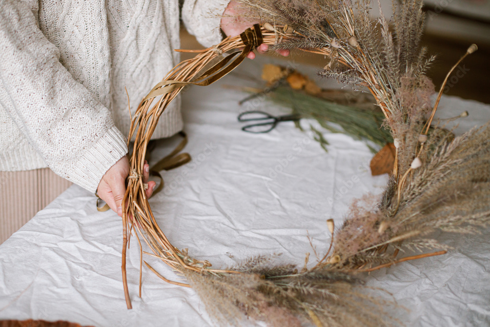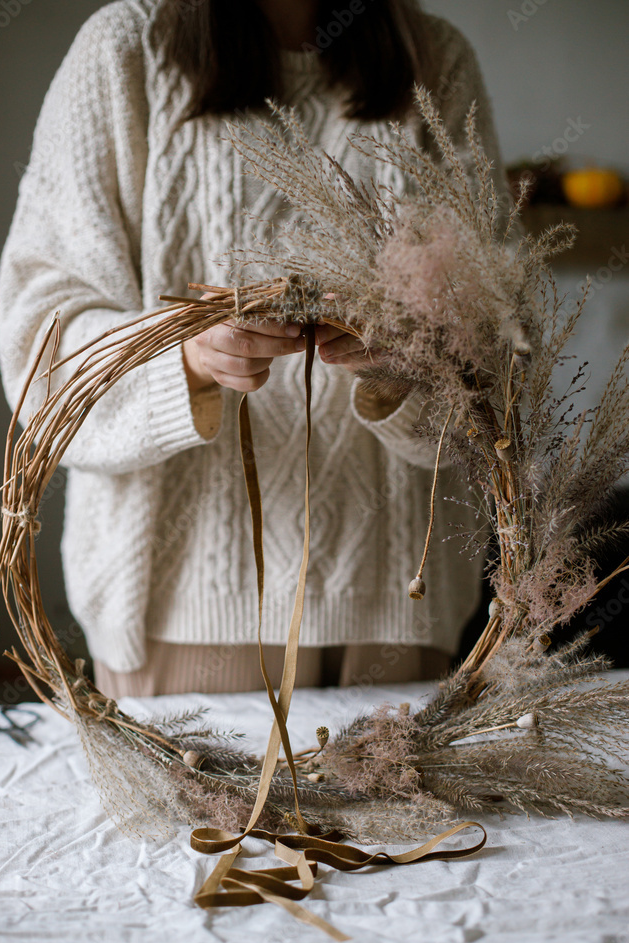 Das Schöne, jeder Kranz trägt etwas von dir. Nicht nur durch die Form, sondern durch den Moment, in dem er entstanden ist. Vielleicht mit einem Glas Wein daneben, Musik im Hintergrund…Vielleicht allein, vielleicht mit jemandem zusammen. Vielleicht mit Hund an der Seite…