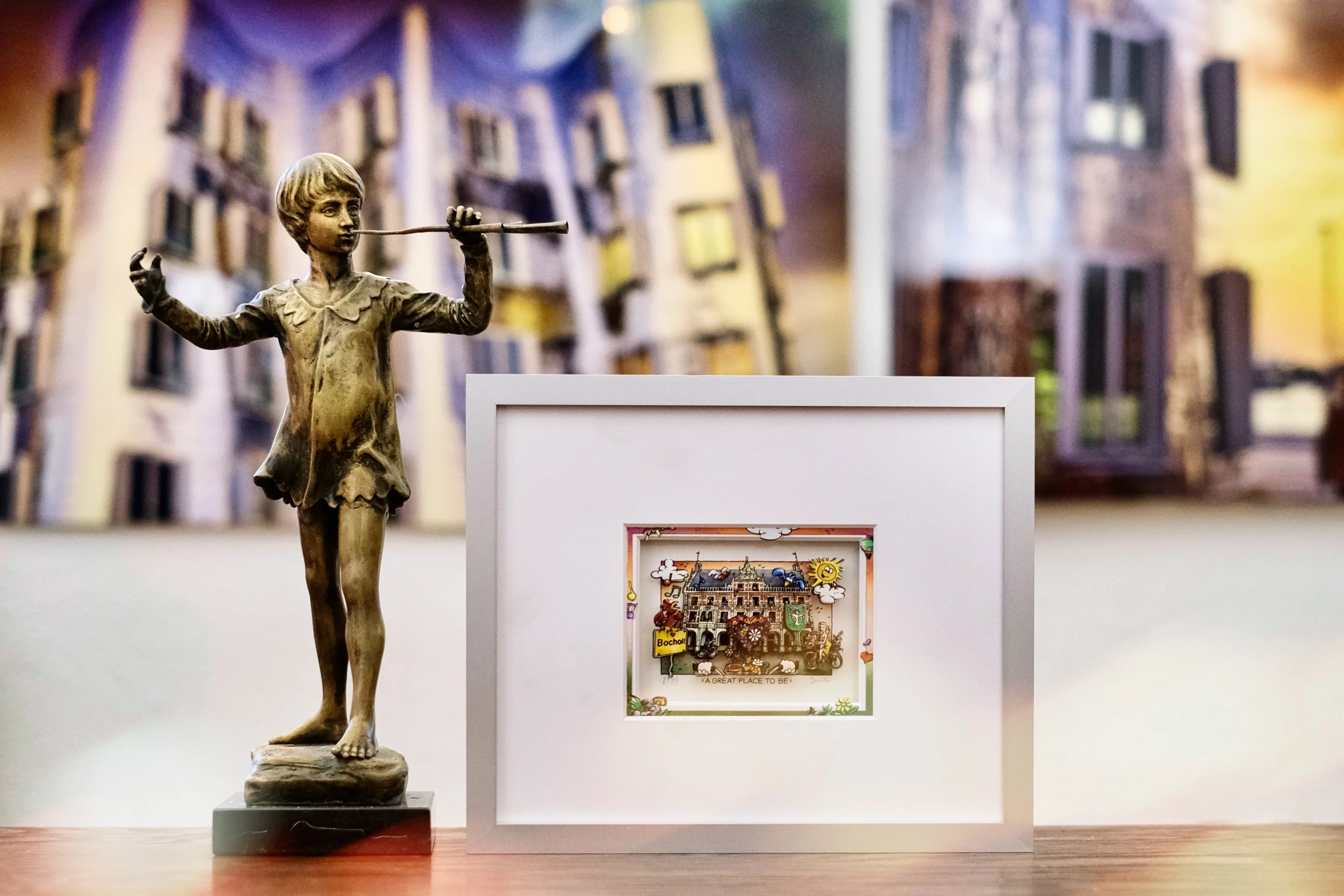 Zeit, die Erinnerungen aufzufrischen … gerne mit einem eingeschenkten Glas Wein und dem kleinen Branko-Bild, welches ich vor mir aufstelle. Abgebildet … 3D-artig inszeniert … ist unser Historisches Rathaus … mit vielen liebevollen Accessoires. Dieses Kunstwerk, so possierlich es auch wirkt, macht einfach gute Laune. Ich drehe den amtlichen Rahmen … auf der Rückseite ein bordeauxroter, runder Aufkleber mit Peters Branding „Kunst tut gut“. Recht hat er, der Peter – Zeit, uns mal intensiver über seinen Claim auszutauschen.