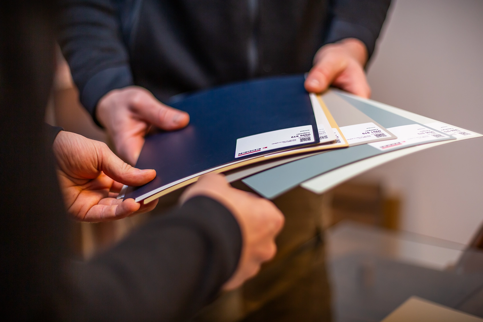 Oftmals erhalten wir Pinterest-Screenshots oder Fotos, die mehr aussagen als tausend Worte. Danach suche ich dann entsprechende Muster der Materialien und Farben aus, die ich mit zum Termin nehme. Wir bringen gezielt das mit, was den Nerv treffen könnte. Wenn der Kunde es clean, hell, reduziert möchte … wäre es ein Stimmungskiller, ihm dunkle, rustikale Dekore zu präsentieren. Genauso gehen wir bei der Umsetzung vor – da steht der persönliche Geschmack vor Standardlösungen. Lieber ein individueller Stollenbau-Raumtrenner als ein Format nach Schema F. Sauber geplant und individuell gebaut.