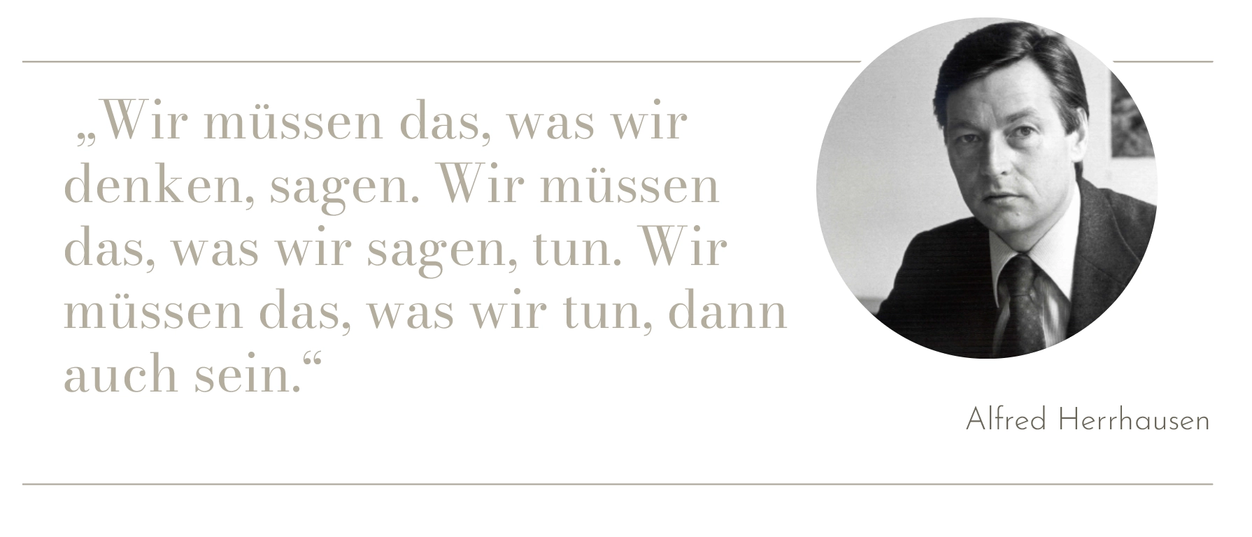 Franz-Josef Heidermann: Der passende Satz dazu stammt von Alfred Herrhausen, dem ehemaligen Sprecher der Deutschen Bank: „Wir müssen das, was wir denken, sagen. Wir müssen das, was wir sagen, tun. Wir müssen das, was wir tun, dann auch sein.“ – der steht seit langer Zeit auf meinem Schreibtisch.