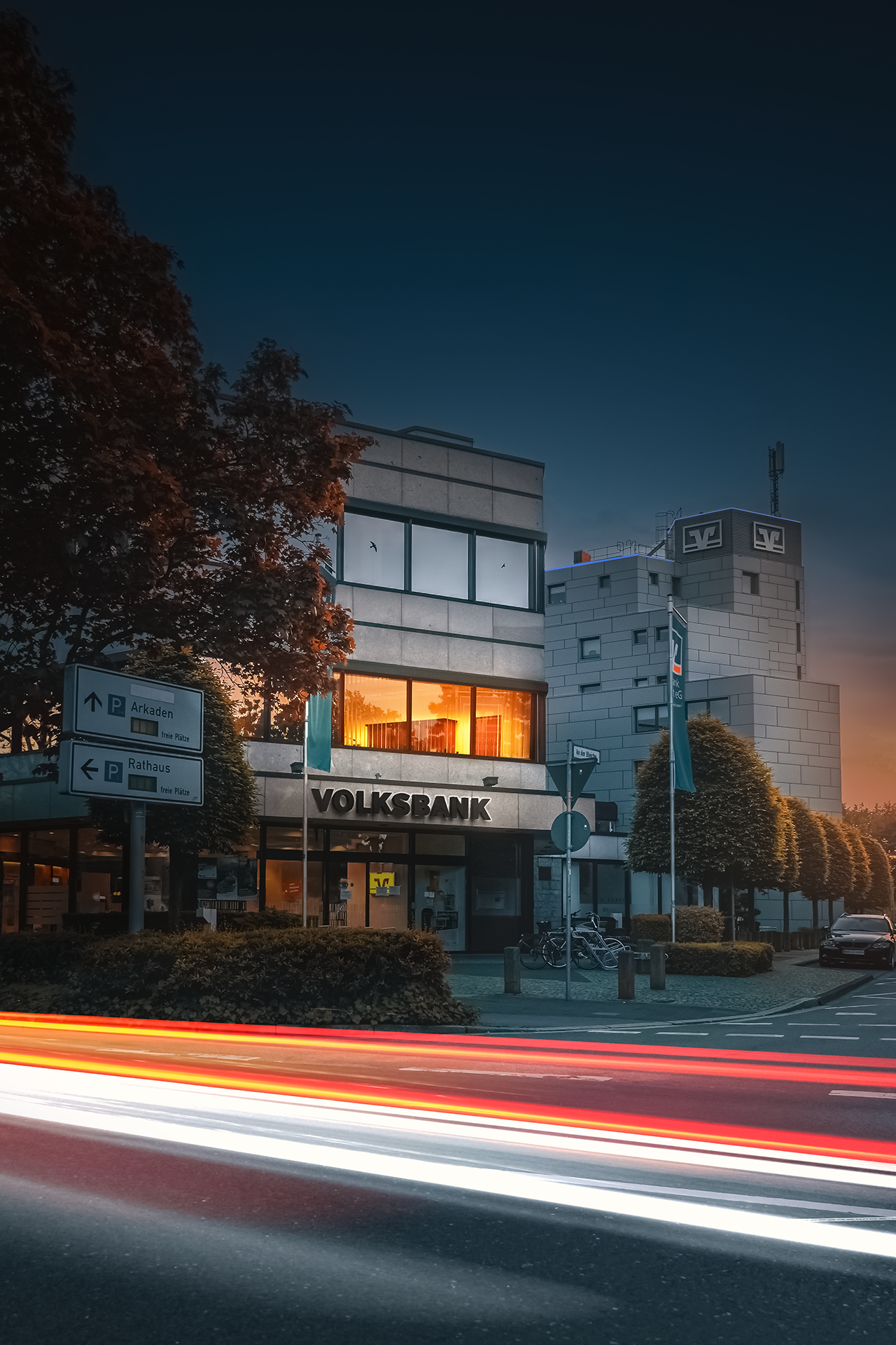 Kirsten und ich steuern den Parkplatz „An der Bleiche“ an. Dort, wo früher unsere Feuerwache ihren Sitz hatte – wo in Zukunft die neue Maria Montessori Schule errichtet werden soll – und wo sich gerade die ersten Schaustellerwagen für die bevorstehende Kirmes formieren. Möglicherweise nicht die klügste Idee, denen beim Aufbau in der Quere zu kommen. Dann lieber Gefahr laufen, sich wie beim letzten Mal ein Knöllchen einzufangen – auf dem Parkstreifen neben der Hauptstelle der Volksbank, zu deren Vorstand wir uns auf den Weg gemacht haben.