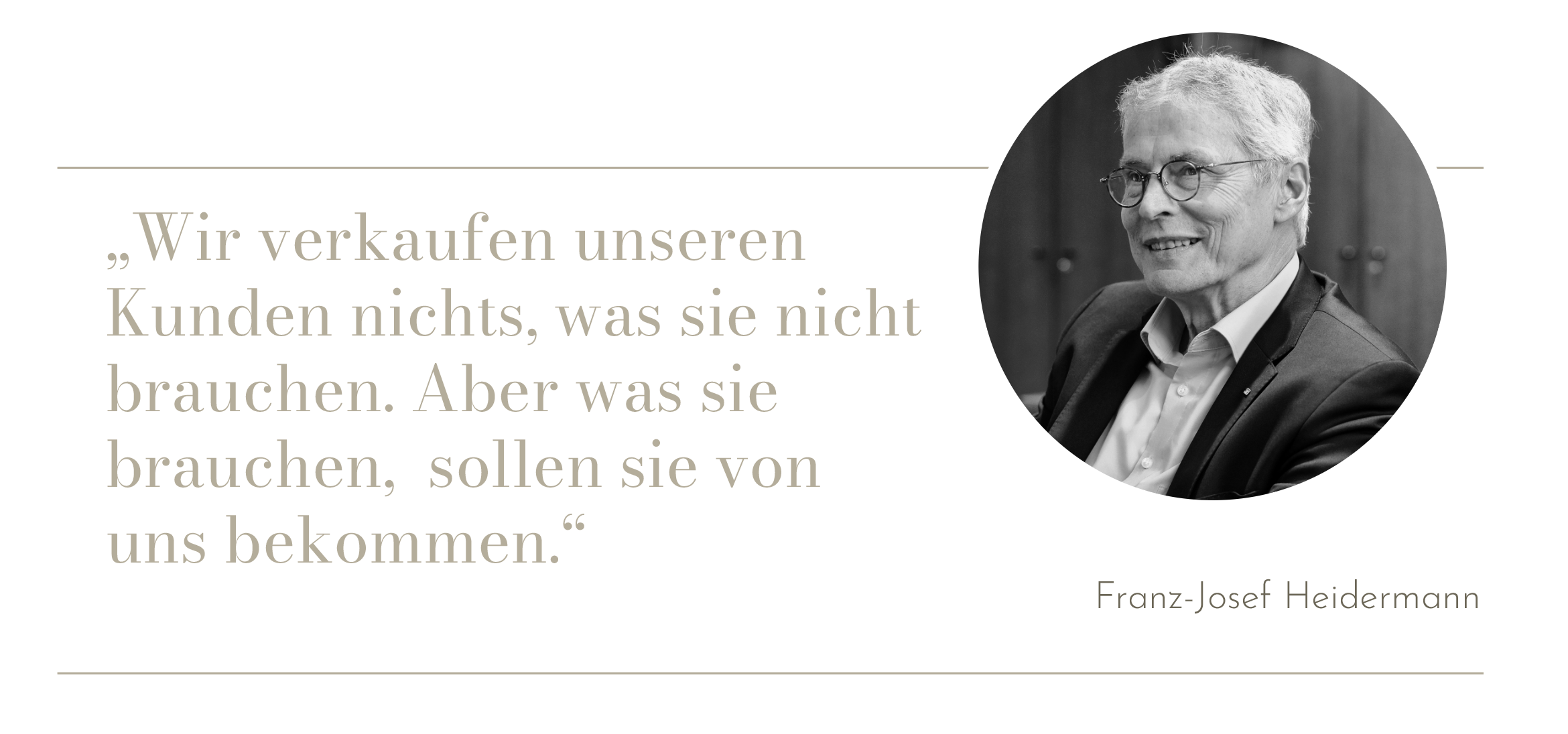Franz-Josef Heidermann: Ersteres auf jeden Fall. Wenn ich ein Wort gebe, dann halte ich das. Das muss auch so sein – darauf muss der Kunde vertrauen dürfen. Empathisch … das mögen andere entscheiden. Ich glaube schon, dass ich ein gutes Gespür für Zahlen … und ein gutes Gespür für Menschen habe.