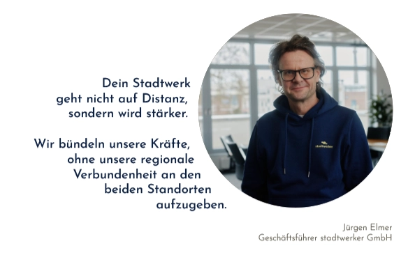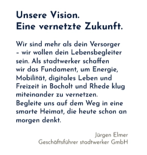 Energie ist auf dem heutigen Markt austauschbar. Den reinen Strom oder das Gas bekommst Du überall. Aber die Lebensqualität vor Ort, die ist eben nicht austauschbar. Wir wandeln uns vom reinen Energieversorger zu einem Full-Service-Provider für unsere Region. Es geht längst nicht mehr nur um Energie, sondern ebenso um digitales Leben, um Freizeit und um Mobilität. Genau da setzt unsere Dachmarke an: stadtwerker wird die übergreifende Klammer sein, die all diese Bereiche bündelt, damit wir den Menschen in Bocholt und Rhede künftig alles aus einer gemeinsamen Hand anbieten können.